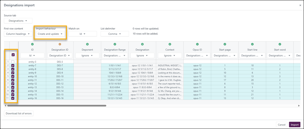 When creating new designations or adding more context to existing designations, you can do so by importing data via a spreadsheet. During collaborative designation review, you can add responses to the designations in a transcript by importing designations from a file.