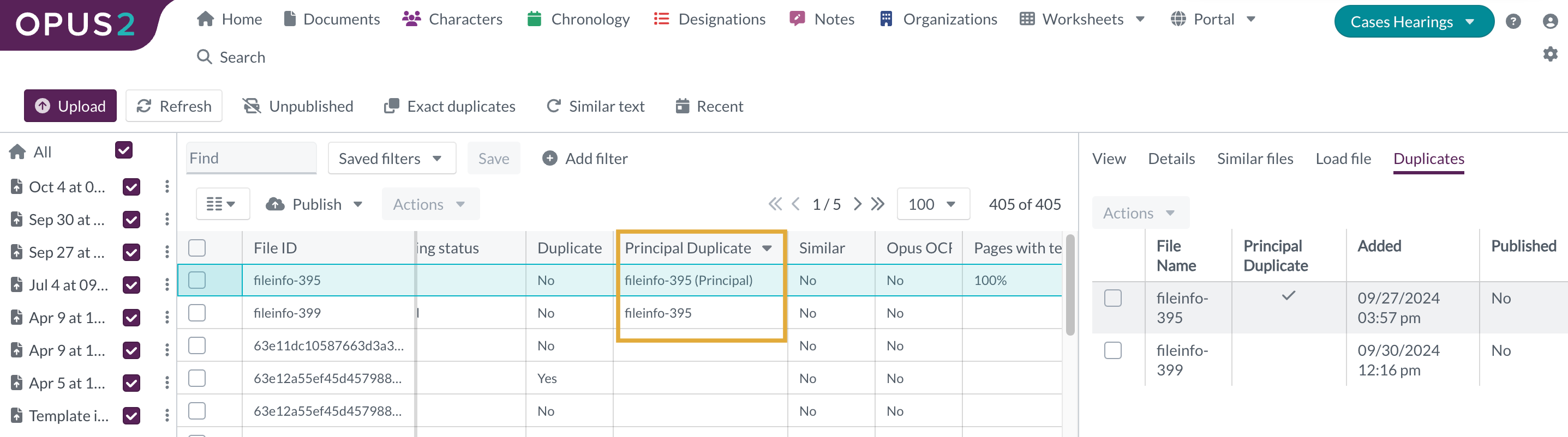 The Principal Duplicate field shows whether a document has exact duplicates present in the project. The first file uploaded within a duplicate group is identified as the principal file. A user with access to the Files page can declare a different file within the group as the principal file.