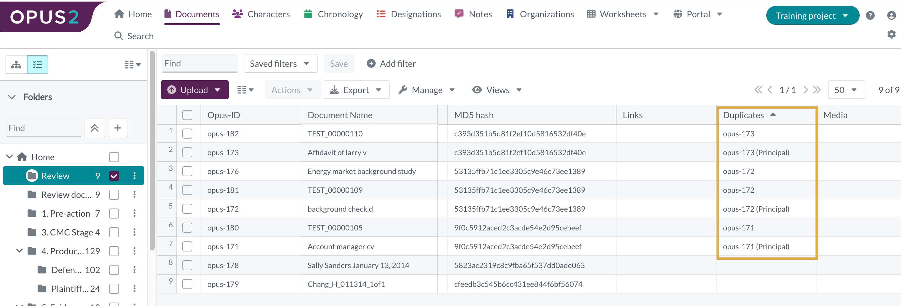 On the documents page, it is possible to search for duplicates of a specific documents by filtering on the MD5Hash field. This is a system field that displays the value for each document. Documents that are identical in content but have differing filenames still contain the same MD5Hash value.