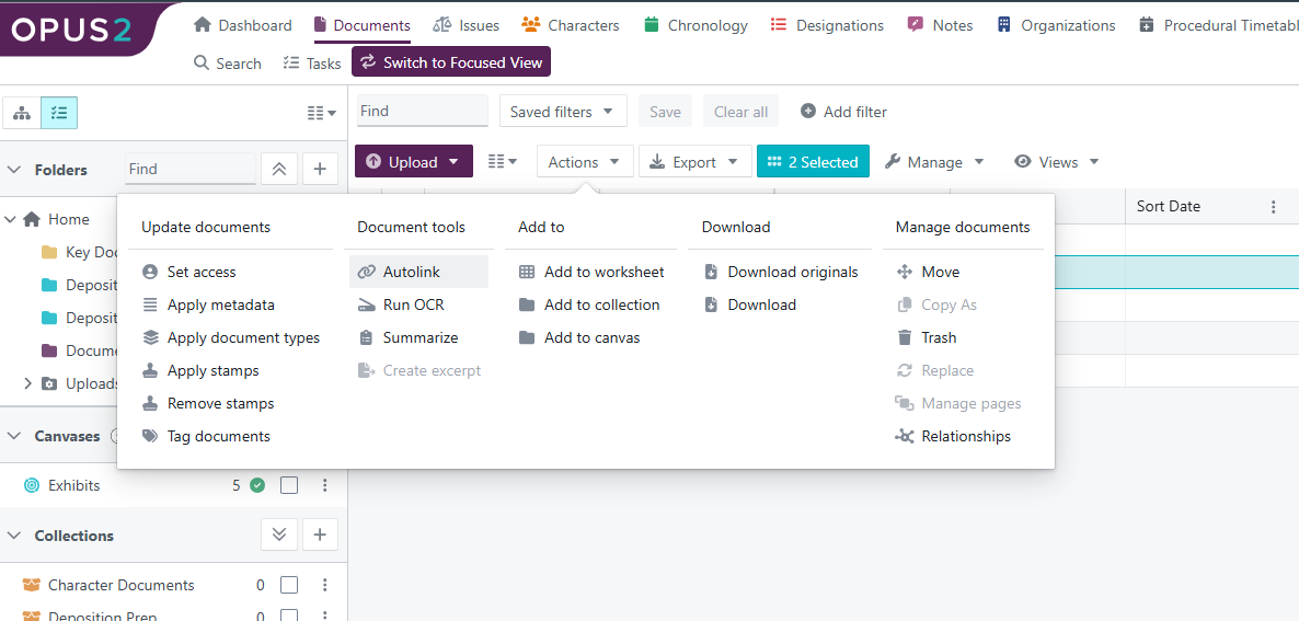 The Autolinking tool in Opus 2 allows users to automatically create links between documents where references to other document IDs appear in the text. The tool scans selected source documents for reference patterns and links them to matching documents within the same project.