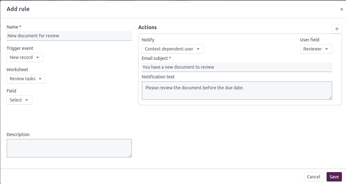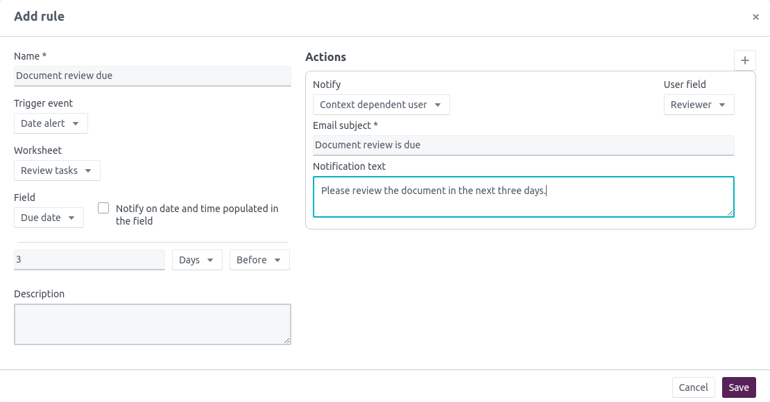 For both rules, the recipient of the notification will be dependent on the name of the user that has been entered into the ’Reviewer’ field.