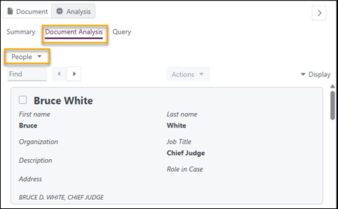 Selecting People analyses the document for specific characters. AI Analysis attempts to extract the following information about each person, depending on what is available in the document: first name, last name, organization the person is associated with, job title, description of the person, role played by the person in the case, and address. If not all the information is available the person is still extracted, with some fields left blank.