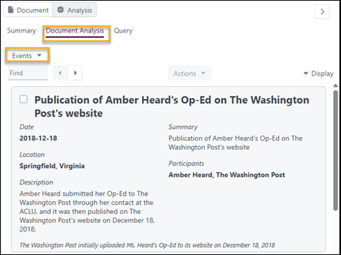 Selecting Events analyses the document for specific events. AI Analysis attempts to extract the following information, depending on what is available in the document: date, summary of event, location of event, name of participants, and description of what took place. If not all the information is available the event is still extracted, with some fields left blank.