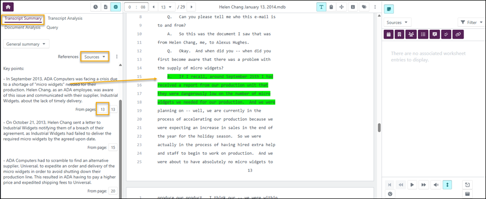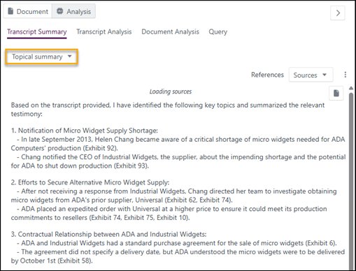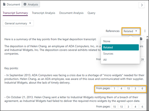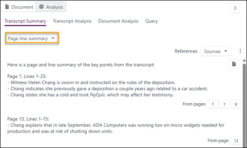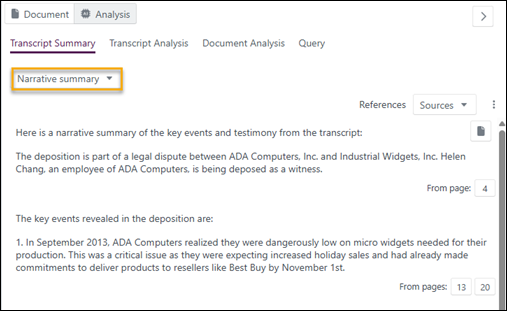 This is a detailed in-depth overview of the transcript, citing the relevant page and line numbers. It allows users to quickly skim a transcript to find where relevant statements or events take place. The results are returned as individual brief paragraphs with relevant page numbers listed below each paragraph. Selecting the page number show the references in a popout. Selecting the page number from the Transcript Viewer opens the transcript on that page with the relevant text highlighted.