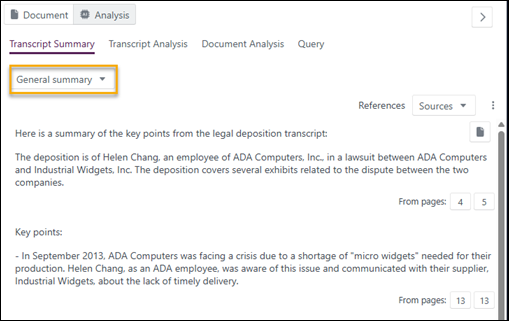 General summary provides a summary of the complete transcript text in approximately six hundred (600) words. The results are returned as a selection of highlighted points or topics, with relevant page numbers listed below each topic. Selecting the page number show the references in a popout. Selecting the page number from the Transcript Viewer opens the transcript on that page with the relevant text highlighted.