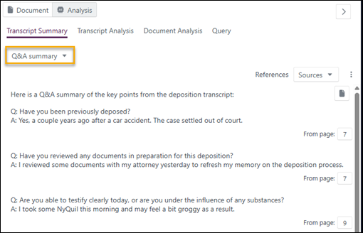 A Q&A summary presents the deposition in a simple question and answer structure, mirroring the flow of the original transcript. This allows you to analyze the witness testimony within the context of the questioning. Results are returned as brief question and answer pairs. Relevant page numbers in the transcript are listed below each pair. Selecting the page number show the references in a popout. Selecting the page number from the Transcript Viewer opens the transcript on that page with the relevant text highlighted.