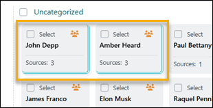 - If you are working on a case with colleagues and you see lines already around an entity, it means that they have already merged multiple sources for an entity. For example, here there are three sources shown for the person Amber Heard and also for John Depp: