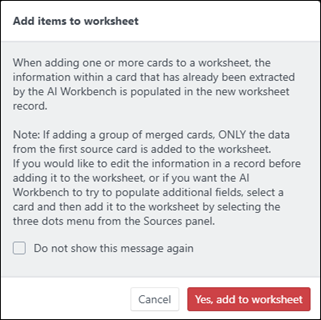 - If you are happy with the merged groups, select Yes, add to worksheet. If not, take the steps outlined in the message. After an entity has been added to a worksheet, an icon is shown on the entity card.