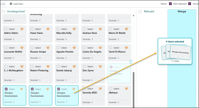 - If you have multiple entities of, for example, a character that are very similar to each other, you can merge them into one source for that character. Select the entities by selecting the checkboxes. Drag them in to the Merge column.