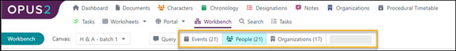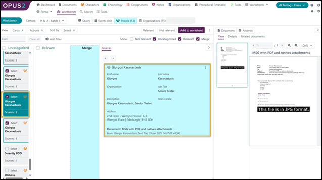 The Opus 2 AI Workbench provides a single environment to view all information discovered across every document or transcript in a canvas in one single interface. AI Workbench provides users with the ability to find and filter through all the entities found in a batch of documents. Users can then go on to view the source documents that the entities have been found in, including viewing the summaries, key sentences, characters, organisations, and events.