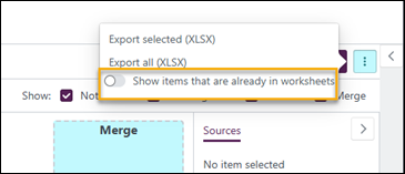 - To see a more focussed view of those items that are yet to be added to a worksheet, select 3-dot kebab menu, select the Show items that are already in worksheets toggle and switch it off.