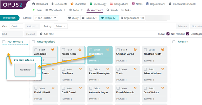 - To sort entities into virtual paper piles for Relevant and Not relevant, drag an entity across into the appropriate column. Alternatively, select the entities by selecting the checkboxes, then select Actions > Move to at the top left, or select the Relevant and Not Relevant buttons at the top right.