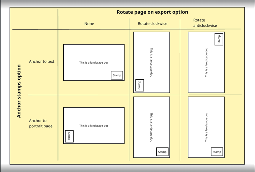 - If stamps are configured to be anchored to portrait page (as described above for the Anchor stamps to setting), stamps anchored to the page should be readable left-to-right in the rotated PDF. Stamps behave as follows based on the selected Page Rotation option: