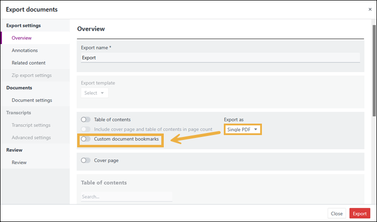 - Select Single PDF to expose the Custom document bookmarks option.