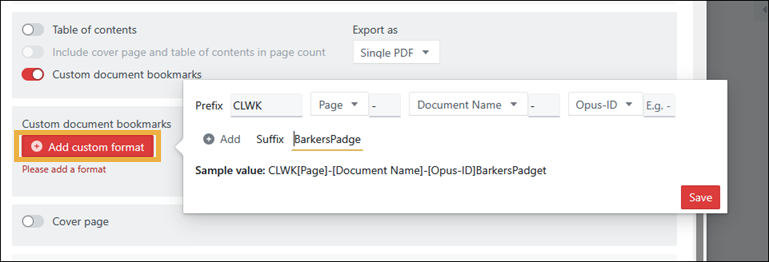 - Custom document bookmarks - This option enables you to set up a custom format for PDF bookmarks on export for single PDFs. For example, PREFIX:[Page]-[Opus-ID]-[File name]_SUFFIX. By default, if no custom formatting has been applied, then the bookmarks export with the Opus-ID (this is the existing bookmark export format).
