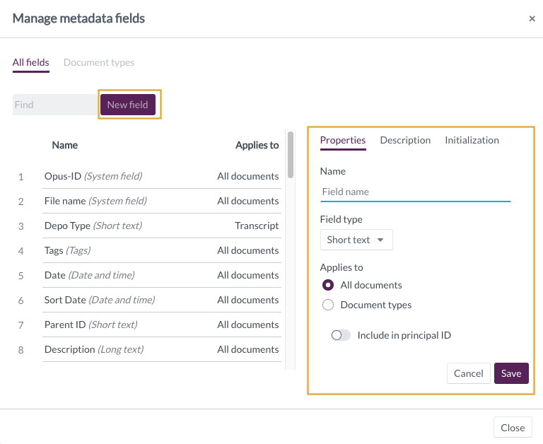 2. In the Manage metadata fields dialog, select New field to open the new field properties on the right.