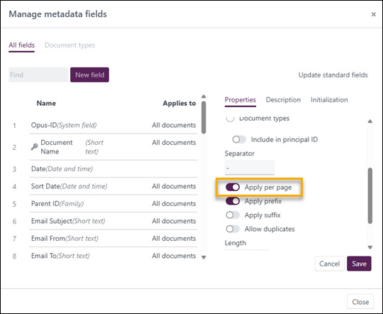 To apply the new field to a single document, open the document view Details pane and add a new prefix or search for an existing prefix. Alternatively, select Actions > Apply metadata.
