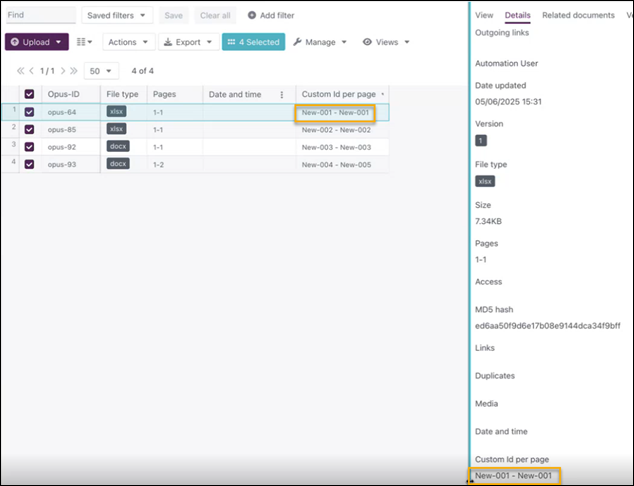 To apply the field to more than one document, select Actions > Apply metadata > Field to be updated > Select Custom Id per page.