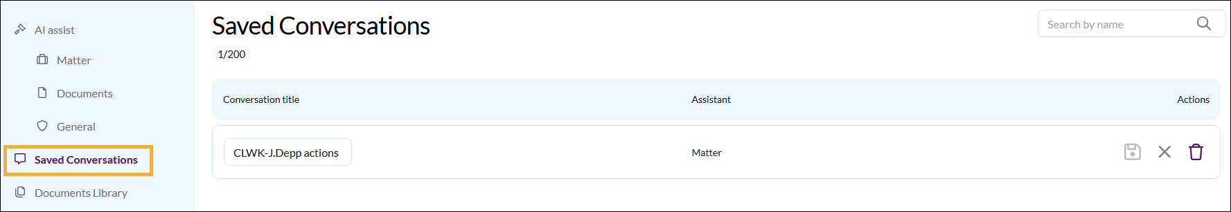 When working with, for example, Matter Assist, you can save your conversation and come back to it later. Saved conversations are private to you and can  deleted.