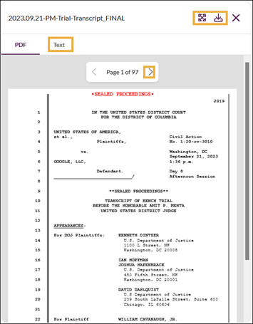 The preview panel opens from which you can scroll through the pages, change to full screen view, download the document, change to text view or close the document.