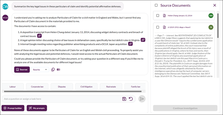 Important: The accuracy, reliability, and usefulness of AI-generated output is directly influenced by the clarity and completeness of the information provided in the prompt. Like a human lawyer, the first draft is never the final version. As a user you will need to follow-up on the AI output with one or multiple prompts to further guide, clarify and specify your requests to help the AI produce the best possible response. Review, verify, and apply professional judgment before relying on AI-generated content.