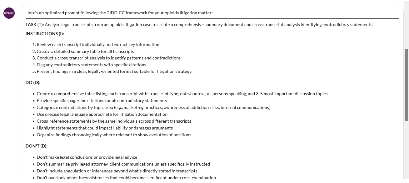 Where appropriate, use established legal terms and concepts rather than general language. This helps align AI output with your workflow and legal reasoning.