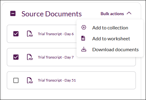 1. If you decide, after working with one or more documents, that you want to add them to a collection, or worksheet, or download them, select the documents and use the dropdown Bulk actions menu.