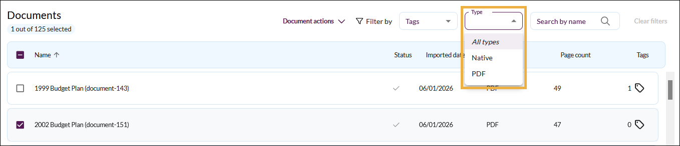 When using the Documents Library, you can now filter documents by type, for example, PDF, Native, or Transcript. The dropdown list updates to reflect the available choices for types in the current library.