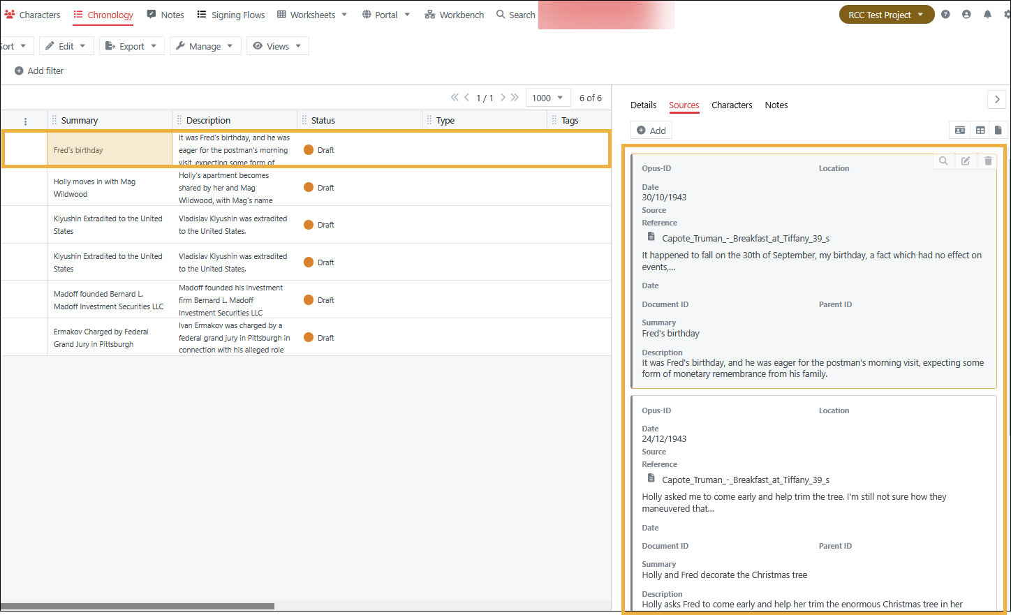 By default, AI Workbench associates the first source from merged records with a worksheet record and a single highlighted text per entry. From release 8.18.5 onwards, you can configure Opus 2 Platform to enable AI Workbench to associate multiple sources and multiple highlighted passages of text with an entity (Character, Chronology, Organisation). This means that, for example, a Character worksheet entry can hold multiple sources / highlights coming from AI Workbench, and attorneys can see and navigate to them directly from the worksheet.