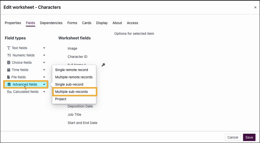 - Select Advanced field > Multiple sub-records.