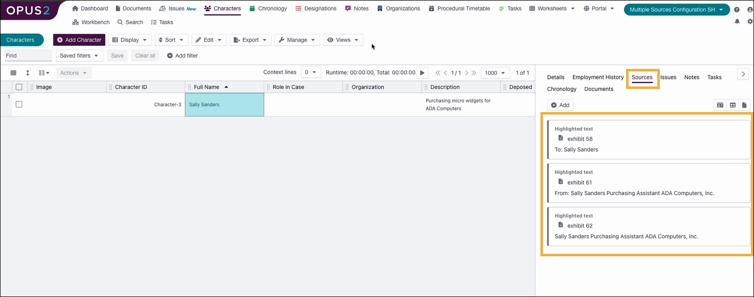 - In AI Workbench, select a Character, Organisation, and Chronology that has more than one source.
