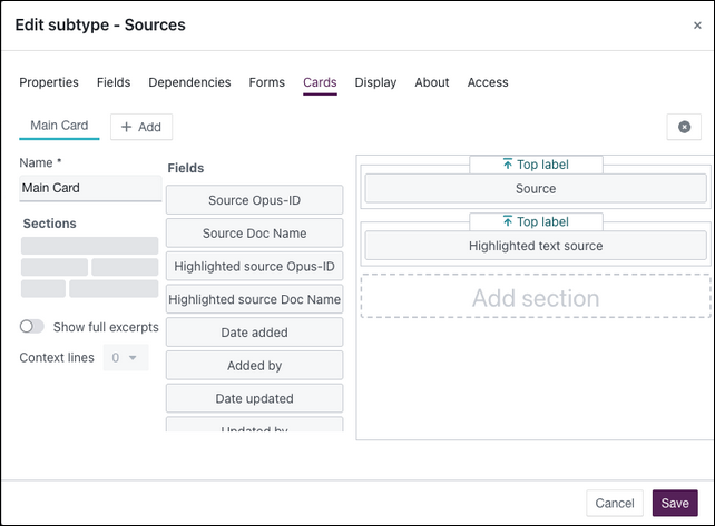 - While still editing the Characters subtype, add the new Highlighted Text field to all relevant forms and cards used within this subtype so that users can view and edit the captured text. See the forms and cards shown below: