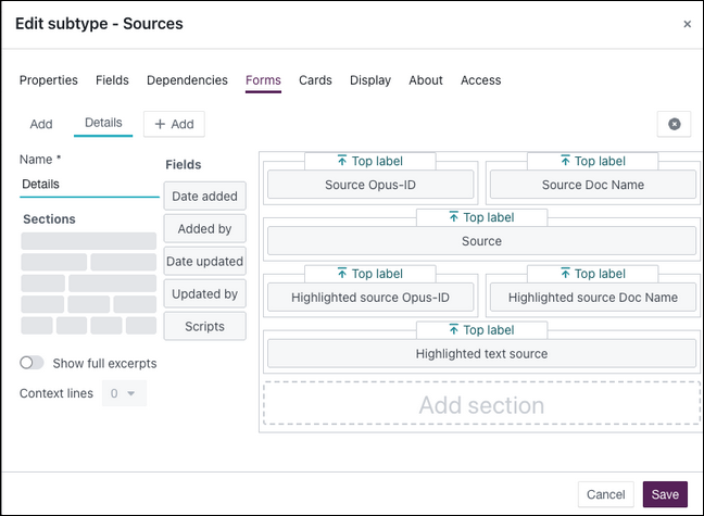 Note: If an Source subtype exists, the Source field was used to attach a full document. This new method we are setting up now adds multiple highlighted text passages so any existing Source field has to be marked as Not Required so as not to interfere with this method.