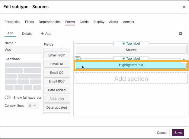- While still editing the Chronology subtype, add the new Highlighted Text field to all relevant forms and cards used within this subtype so that users can view and edit the captured text. See the forms and cards shown below: