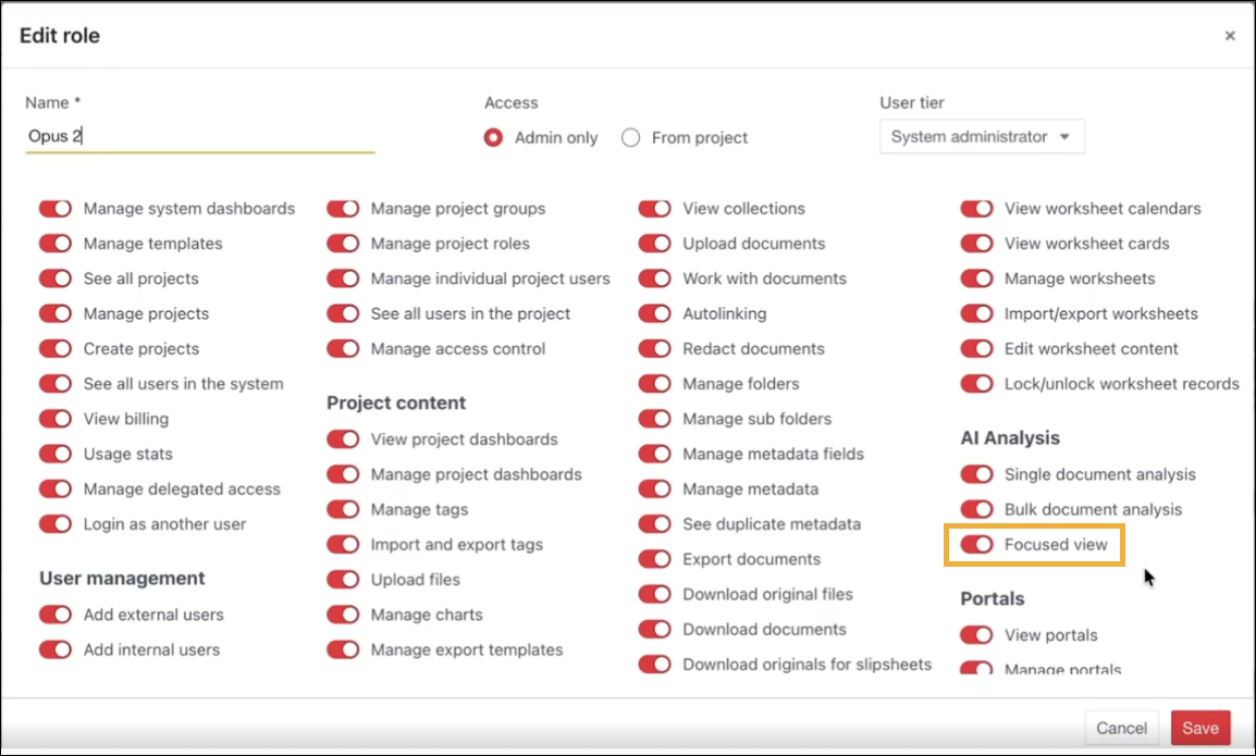 For Opus 2 Solutions Operations and Customer Support staff there are operator-only toggles for Focused View at the tenant and workspace levels.