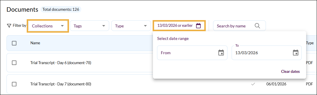 In the Documents Library, there are two new methods for filtering - by collection or by date. Select a collection or section from the Collections drop-down list to restrict your document choice to those in that collection (bundle) or section.